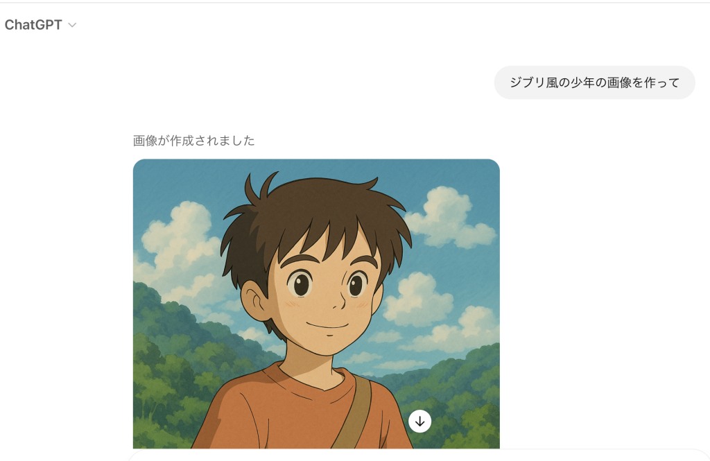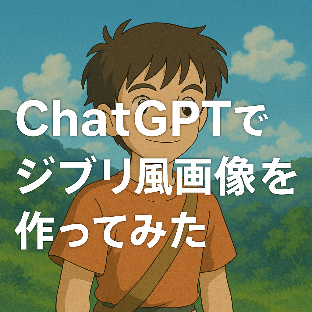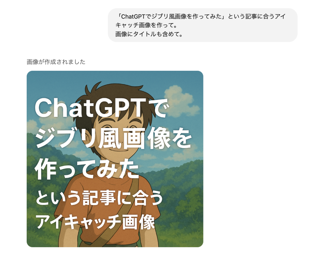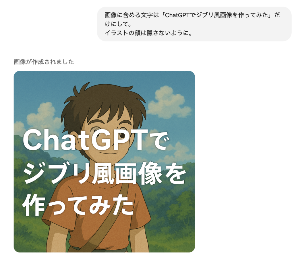 画像に含める文字は「ChatGPTでジブリ風画像を作ってみた」だけにして。