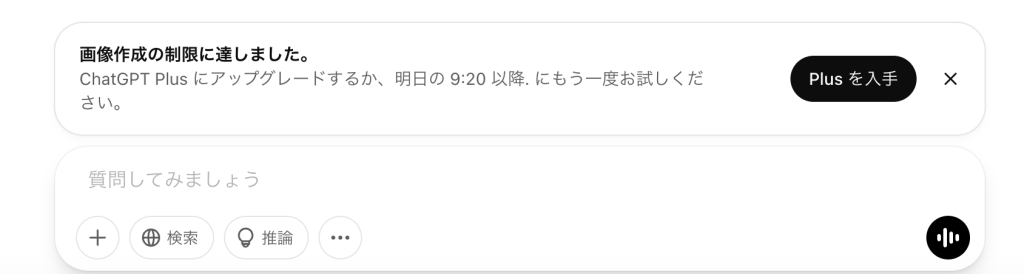 つまり、2025/4/2現在では、無料プランで作れる画像は1日3枚までという制限があるようです🔐