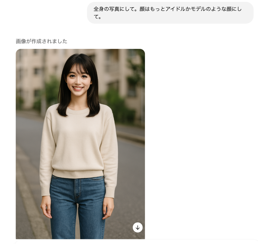そこで、全身の写真で顔をもう少し美人な女性、、というと失礼ですがさっきの写真もすごく美人なのですが、、顔をどのように変えてくれるのも気になったので指示してしました。